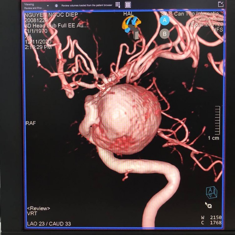 Tuy nhiên, khi chị H. đến Bệnh viện Đột quỵ Tim mạch Cần Thơ được bác sĩ chỉ định chụp MRI 3 tesla, phát hiện có 2 túi phình trong mạch máu não: 1 túi phình khổng lồ động mạch mắt 19x23mm và 1 túi phình nhỏ sau đoạn động mạch mắt 2x2mm.
