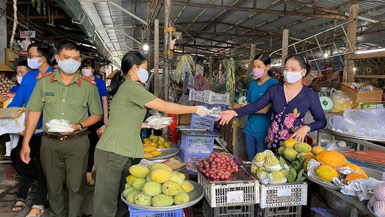 Cán bộ, chiến sĩ Phòng PA03 công an Cần Thơ đến phát khẩu trang cho các tiểu thương