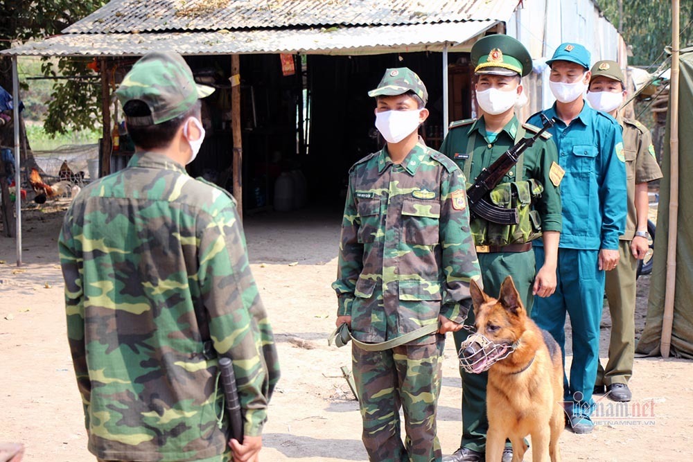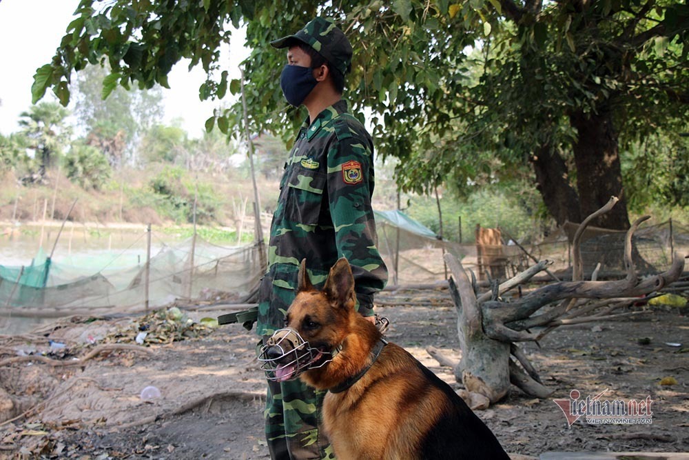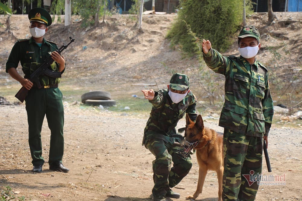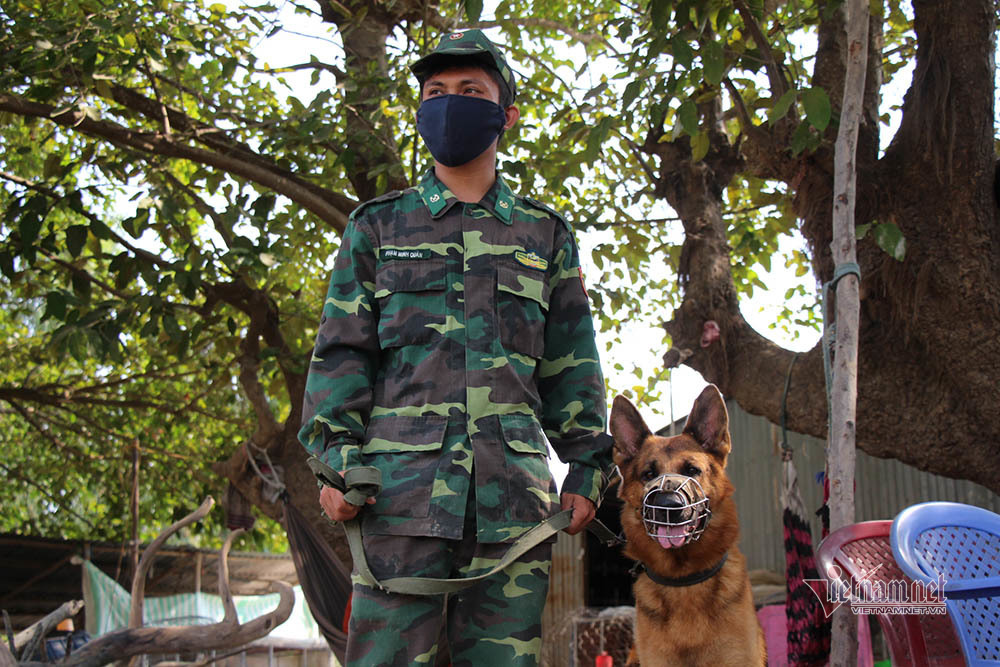 Trong ảnh là Thiếu uý Phạm Minh Quân, được tăng cường về tổ 3 thuộc Trạm kiểm soát Biên phòng cửa khẩu Quốc tế Dinh Bà từ ngày 19/3 để phòng chống dịch Covid-19. Thiếu uý Quân được mang theo một chú chó nghiệp vụ 5 năm tuổi để phối hợp làm nhiệm vụ