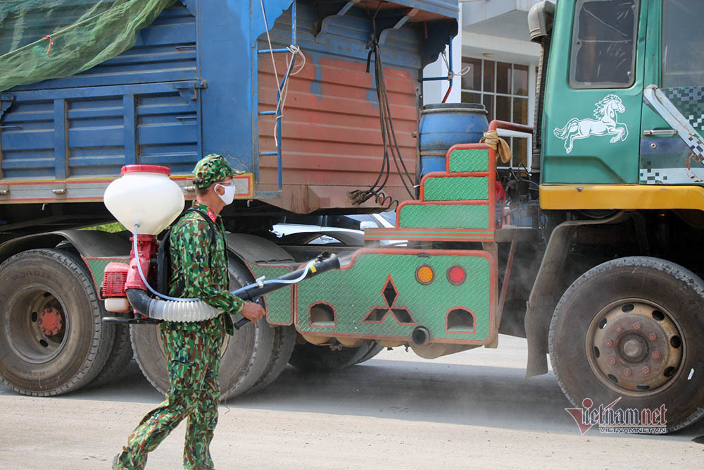 Bộ đội biên phòng phun xịt khử trùng các phương tiện chở hàng hoá từ Campuchia sang