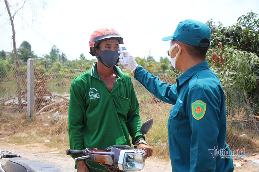 Tại chốt chặn tăng cường ở cửa khẩu Thông Bình, các cán bộ, chiến sĩ kiểm tra thân nhiệt từng người dân qua lại