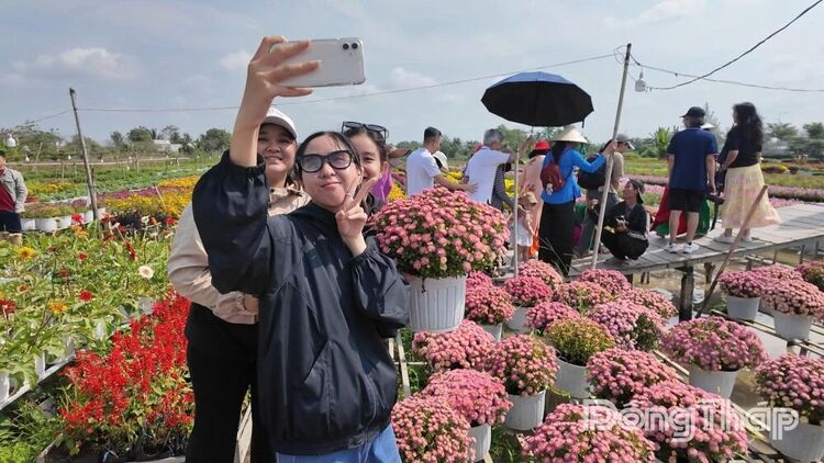Du khách chụp ảnh bên những chậu cúc mâm xôi “Song Hỷ”.