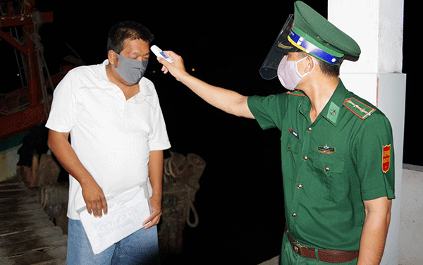 Đại tá Lương Hoàng Đông, Chỉ huy trưởng BĐBP tỉnh Cà Mau, trong chuyến kiểm tra công tác phòng chống dịch COVID-19 trên biển và chỉ đạo đo thân nhiệt cho các thuyền viên trên tàu đánh cá.
