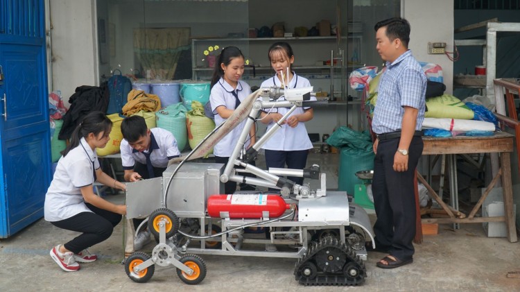 Thầy Nguyễn Phúc Thịnh và các học sinh bên robot chữa cháy.