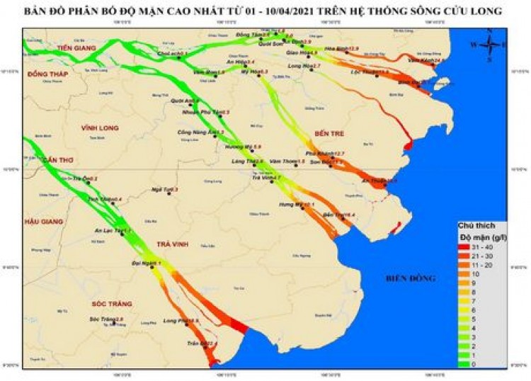 Bản đồ phân bố độ mặn cao nhất trong 10 ngày đầu tháng 4-2021 trên hệ thống sông Cửu Long.