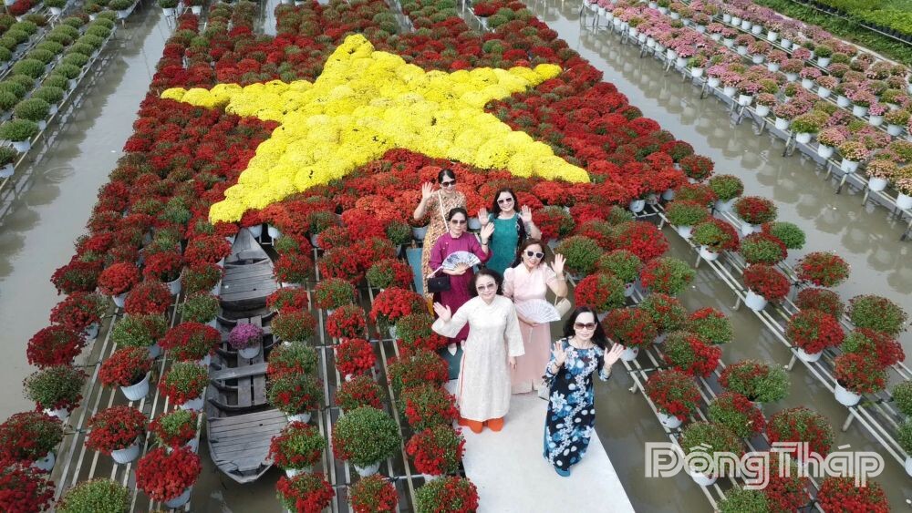 Tại Làng hoa Sa Đéc sử dụng khoảng 500 giỏ hoa cúc mâm xôi xếp hình lá cờ Tổ quốc thu hút khách tham quan.