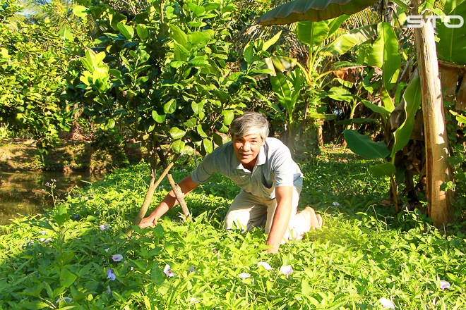 Ông Lê Hùng Cường, ở ấp Kinh Giữa 1, xã Kế Thành (Kế Sách) trồng cỏ xung quanh gốc cây để tạo độ ẩm giúp tiết kiệm nước tưới.