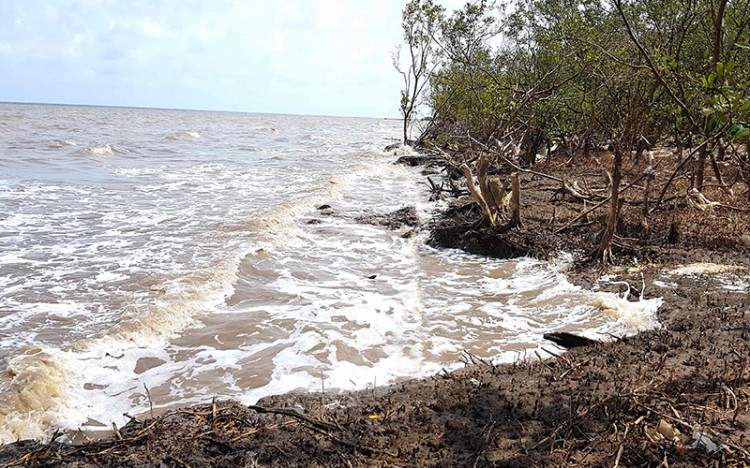 Ðoạn sạt lở 1.900 m từ Ba Tĩnh đến T25 trong bốn đoạn đê biển Tây ở huyện Trần Văn Thời, tỉnh Cà Mau. Ảnh: HỮU TÙNG