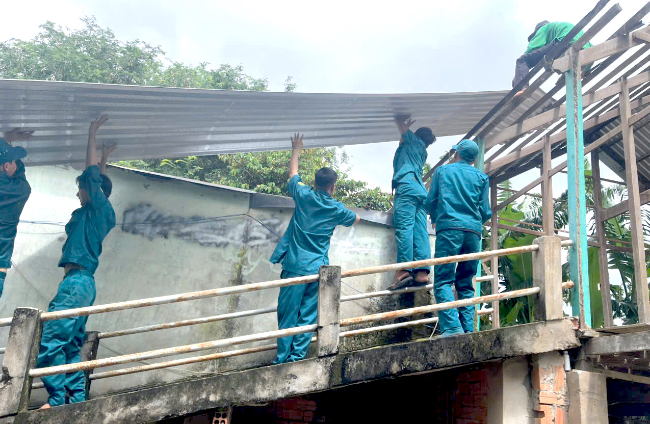 Lực lượng dân quân địa phương đang hỗ trợ di dời phần nhà của một hộ dân bị ảnh hưởng - Ảnh: Đ.T.