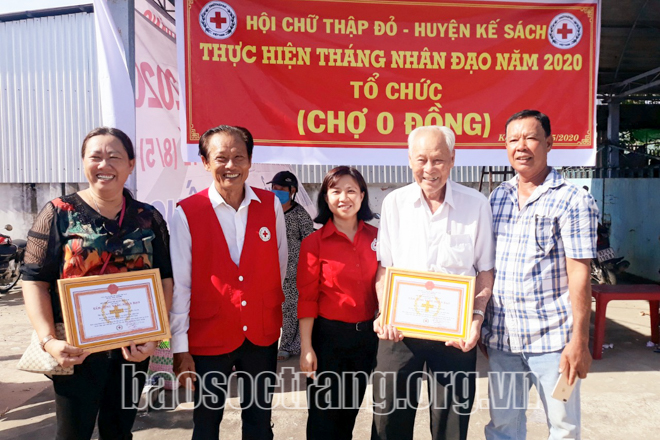 Lãnh đạo Hội CTĐ huyện kế Sách trao bảng ghi nhận tấm lòng vàng cho các mạnh thường quân đã ủng hộ chợ "0 đồng" .