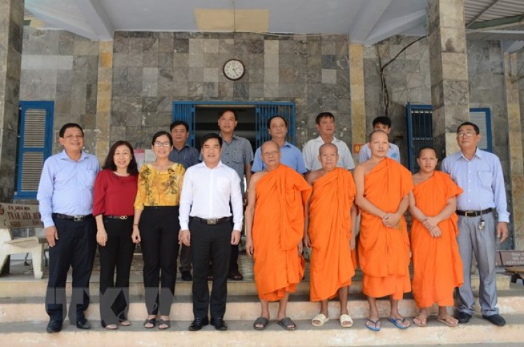 Đoàn công tác của Ủy ban Mặt trận Tổ quốc Việt Nam tỉnh Sóc Trăng do ông Dương Sà Kha làm trưởng đoàn đến thăm và chúc mừng các vị sư sãi cùng cán bộ hưu trí dân tộc Khmer trên địa bàn thành phố Sóc Trăng. (Ảnh: Chanh Đa/TTXVN)
