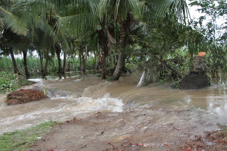 Cùng với tình trạng sạt lở được ghi nhận ngày càng nghiêm trọng thì đợt triều cường cao kỷ lục trong 10 năm qua, xuất hiện trong những ngày cuối tháng 9 đầu tháng 10, đã làm nhiều diện tích sản xuất nông nghiệp và nuôi thủy sản ở các huyện như Long Phú, Mỹ Tú, Kế Sách và Cù Lao Dung bị thiệt hại nghiêm trọng do tràn và vỡ đê, bờ bao.