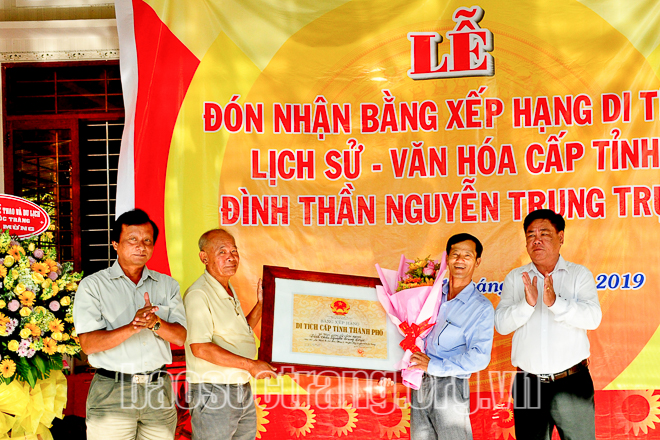 Lãnh đạo Sở Văn hóa - Thể thao và Du lịch trao Bằng xếp hạng di tích lịch sử - văn hóa cấp tỉnh đối với Đình thần Nguyễn Trung Trực. Ảnh: KGT