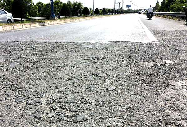 Nhiều điểm trên đường dẫn cầu Cần Thơ bị bong tróc, mặt đường gồ ghề gây khó khăn cho các phương tiện tham gia giao thông.