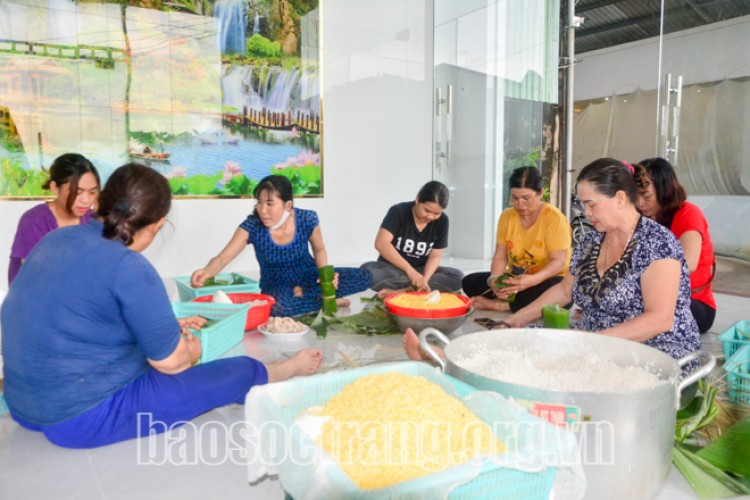 Bà con Sóc Trăng gói bánh tét để gửi ủng hộ đồng bào miền Trung. Ảnh: Lưu Hồng Tài