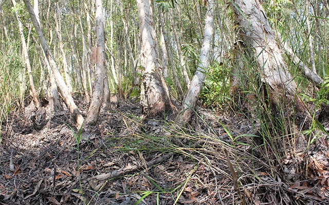 Nắng nóng kéo dài khiến bề mặt rừng tràm Cà Mau khô khốc, dễ xảy ra cháy rừng.