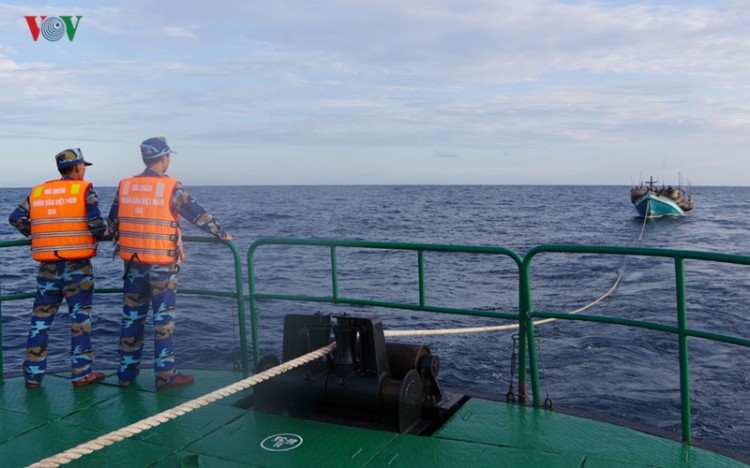 Tàu 954 lai kéo tàu cá bị hỏng máy vào bờ.