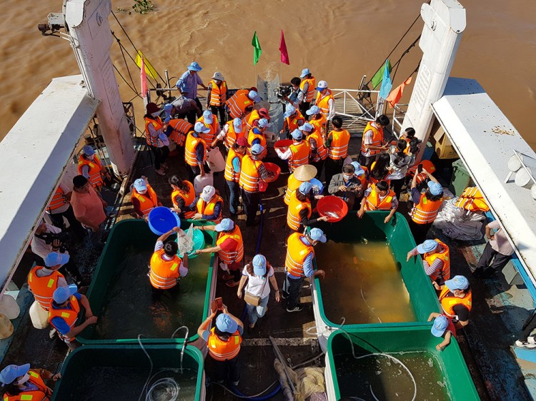 Qua đó, có 18.730kg và 100.550 con cá giống đã được thả tái tạo nguồn lợi (quy ra tổng số lượng cá khoảng 1,12 triệu con), bao gồm những loài cá đặc sản như: cá bông lau, cá hô, mè hôi, vồ đém, chạch lấu, lăng nha, nàng hai, cá linh, cá ét, cá cóc, cá chép, cá basa, cá tra, vồ đém, cá chày, điêu hồng… Đặc biệt, Tổng cục Thủy sản đã hỗ trợ 16.000 con cá hô và bông lau. Đây là những loài cá sông quý hiếm, có giá trị kinh tế cao.