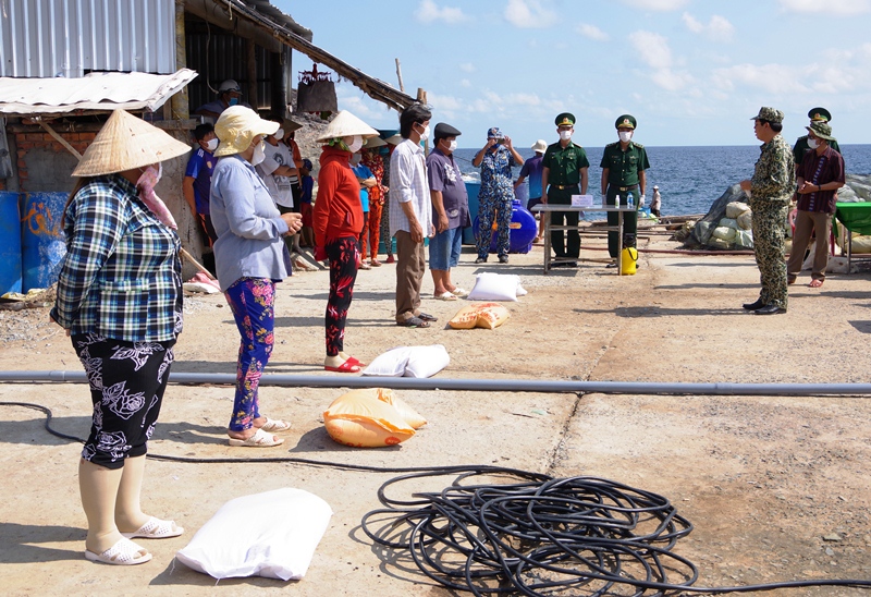 Ông Nguyễn Tiến Hải, Chủ tịch UBND tỉnh Cà Mau, và Đại tá Lương Hoàng Đông, Chỉ huy trưởng BĐBP tỉnh Cà Mau, trao gạo và tiền hỗ trợ cho cư dân trên đảo.