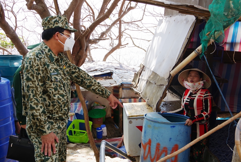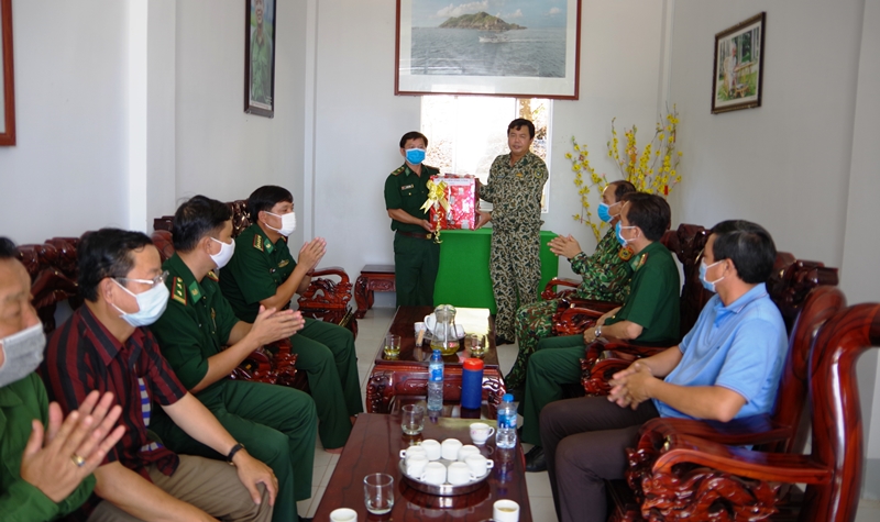 Ông Nguyễn Tiến Hải, Chủ tịch UBND tỉnh Cà Mau, động viên bộ đội biên phòng Hòn Chuối khắc phục khó khăn hoàn thành nhiệm vụ.