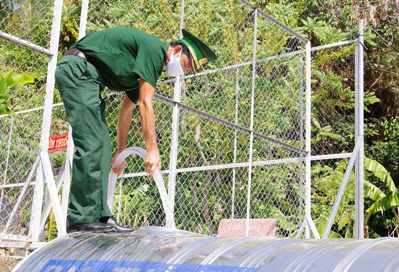 Nước ngọt được bơm lên các bồn chứa của đồn biên phòng để dự trữ.
