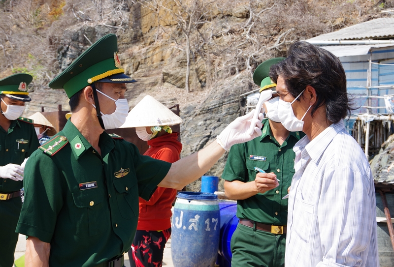 Cán bộ, chiến sỹ Đồn BP Hòn Chuối hàng ngày kiểm tra đo thân nhiệt, hướng dẫn bà con cư dân phòng chống dịch COVID-19.