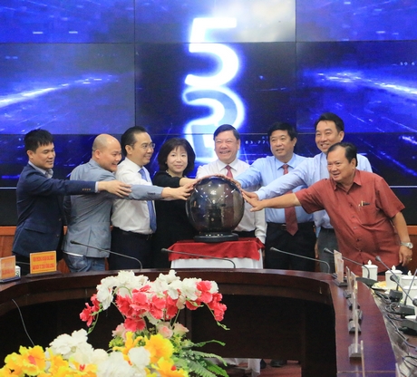 Đồng chí Trần Văn Rón- Ủy viên BCH Trung ương Đảng, Bí thư Tỉnh ủy (người đứng thứ 4 từ phải qua)- cùng lãnh đạo tỉnh, Công ty AIC vận hành thí điểm Trung tâm Điều hành đô thị thông minh.