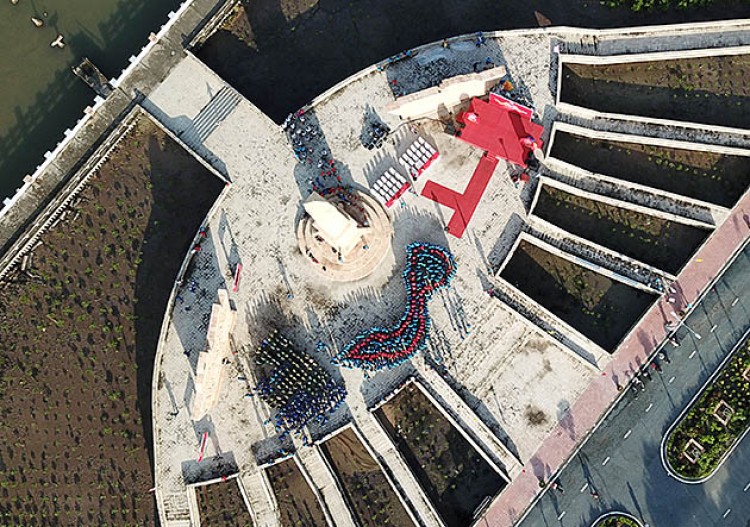 Hình ảnh hơn một nghìn bạn trẻ xếp hình bản đồ đất nước và hát Quốc ca nhìn từ trên cao.