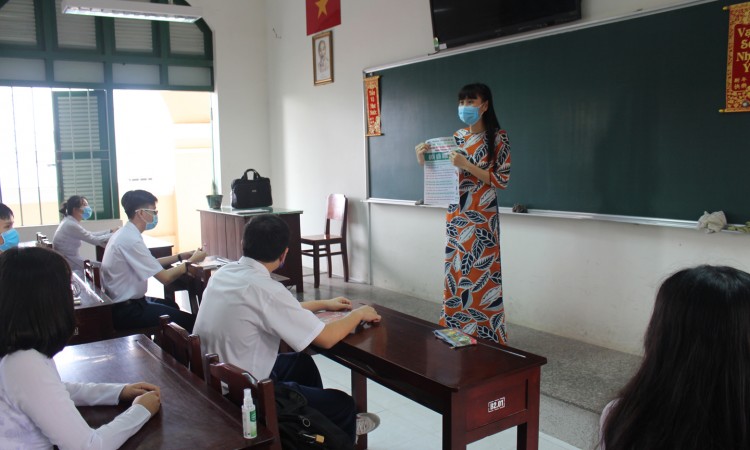Buổi học đầu tiên, giáo viên hướng dẫn các biện pháp phòng chống dịch bệnh cho học sinh.