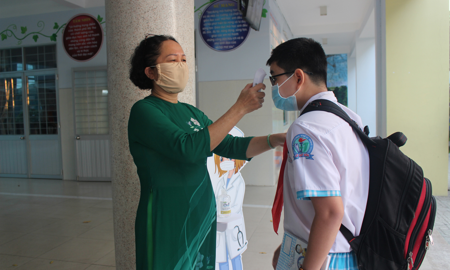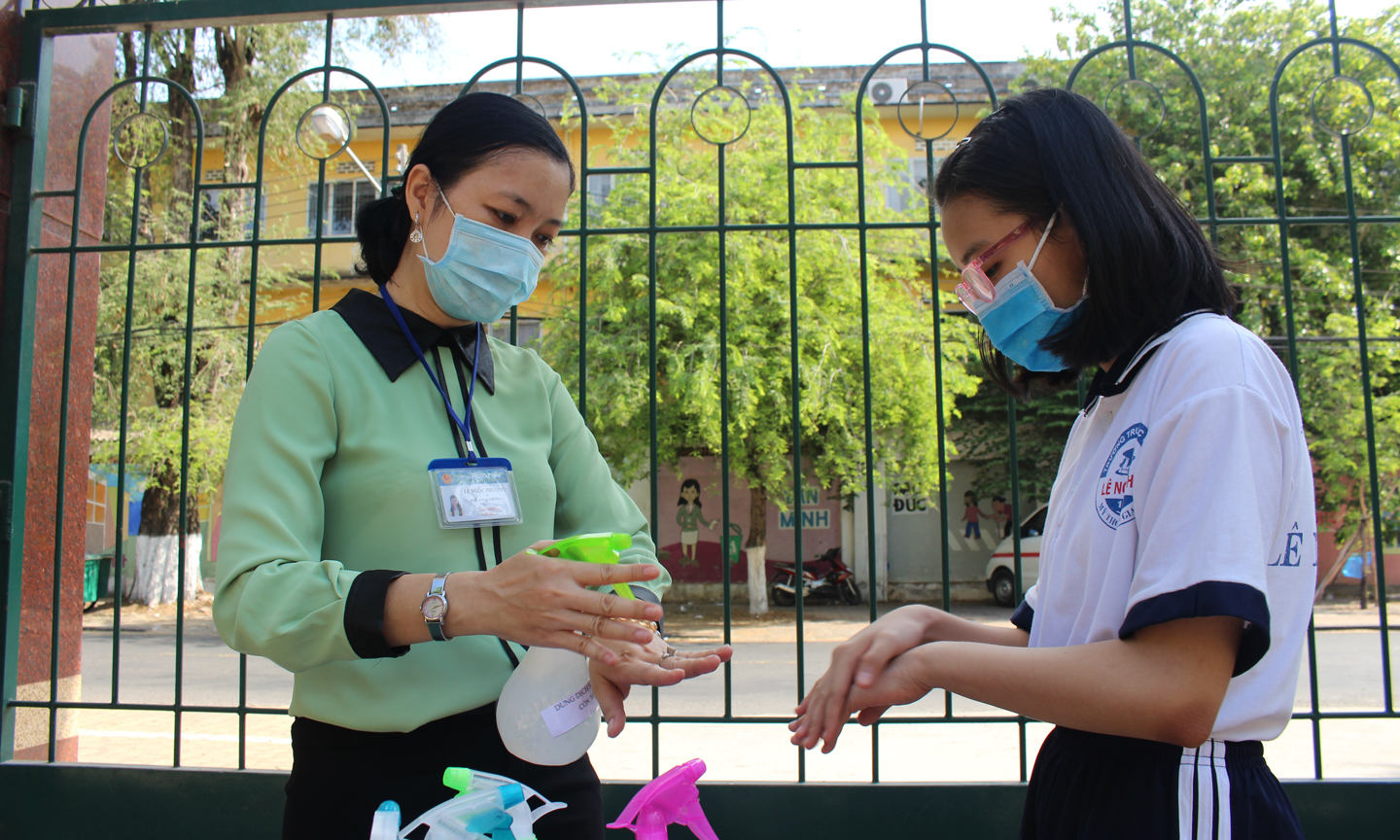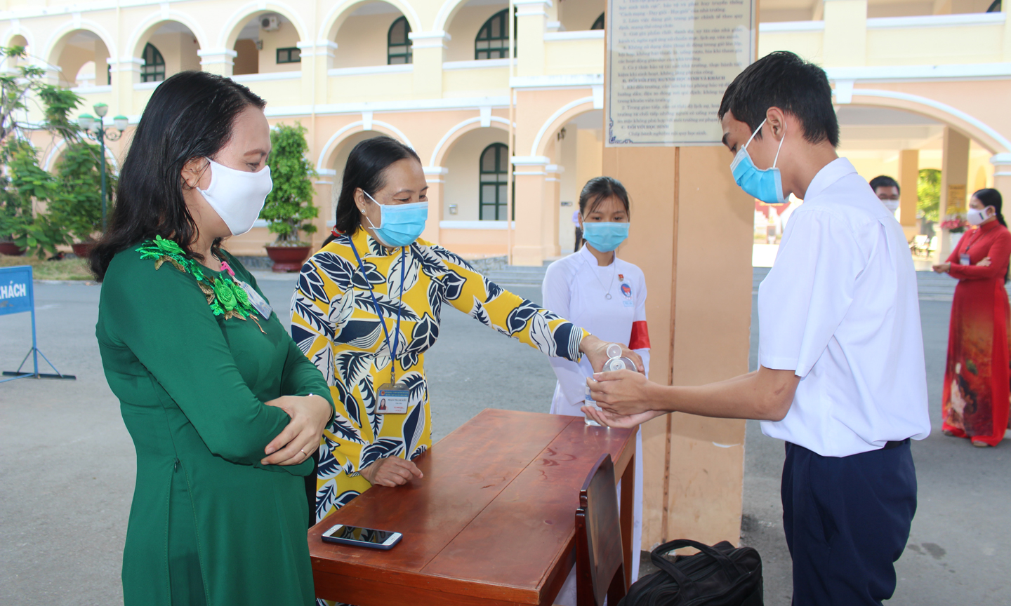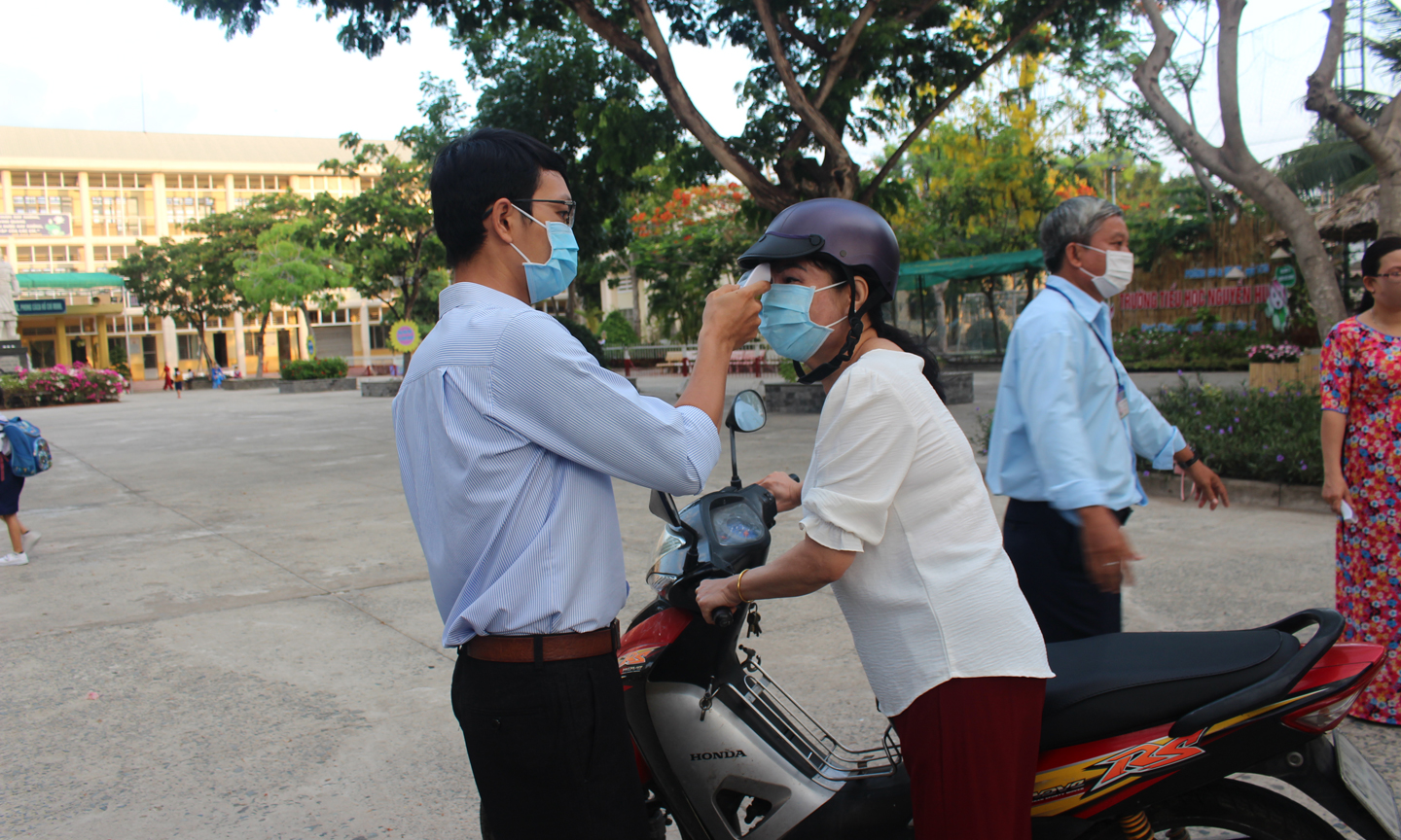 Ngay tại cổng trường Trường THPT Nguyễn Đình Chiểu, giáo viên trường đo thân nhiệt, sát khuẩn tay cho học sinh