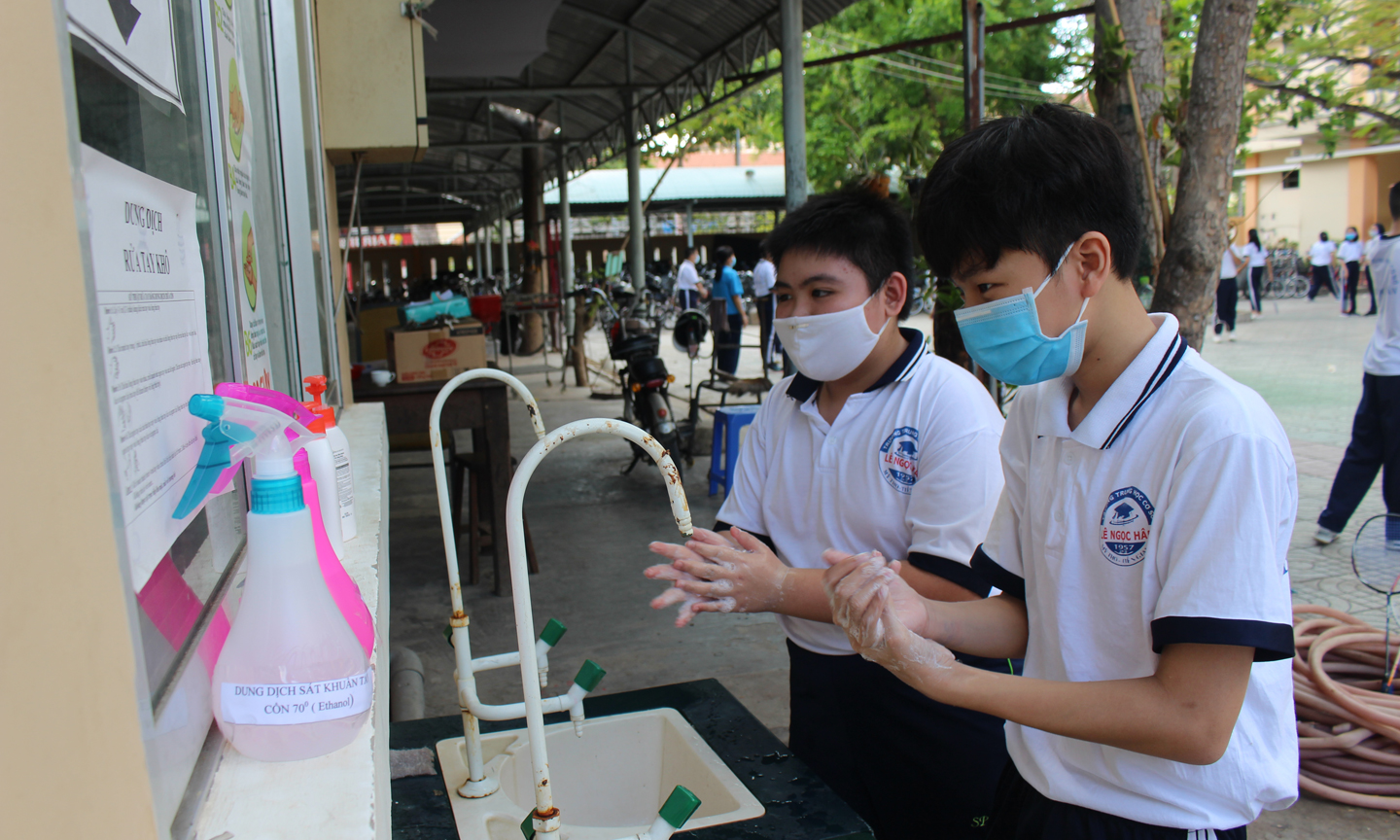 Vệ sinh tay tại Trường THCS Lê Ngọc Hân.