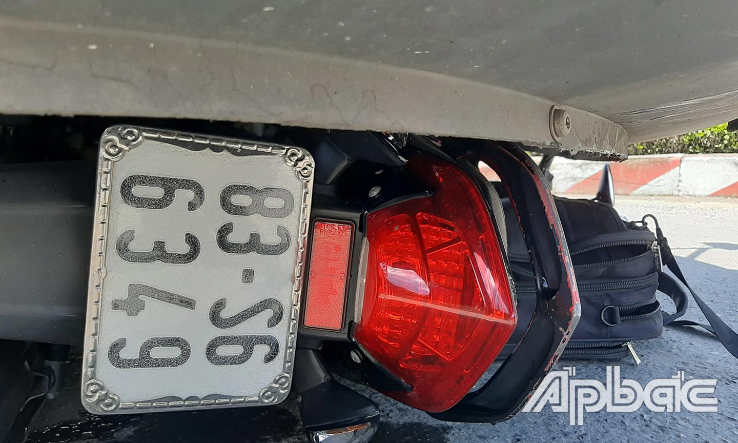 Chiếc xe máy bị cày nát dưới lòng xe container.