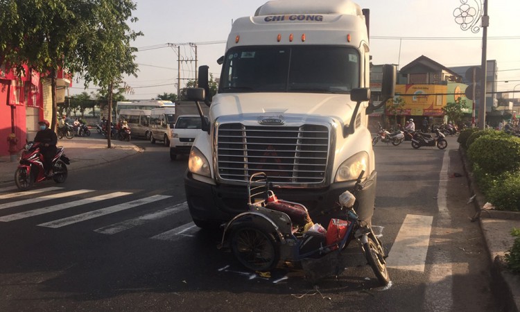 Khi xe lưu thông đến giao lộ Ấp Bắc - Nguyễn Thị Thập, xe container rẻ phải vào đường Nguyễn Thị Thập thì xảy ra va chạm với xe máy 3 bánh (xe dành cho người khuyết tật) lưu thông cùng chiều do bà Nguyễn Thị Gửi (58 tuổi, ngụ xã Phú Kiết, huyện Chợ Gạo, tỉnh Tiền Giang) chở theo con trai là Hồ Văn Tám phía sau.