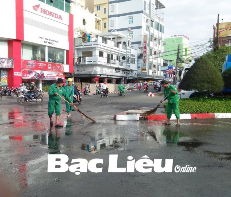Công nhân Trung tâm Dịch vụ đô thị tỉnh quét dọn, làm sạch đẹp đô thị TP. Bạc Liêu. Ảnh: C.L