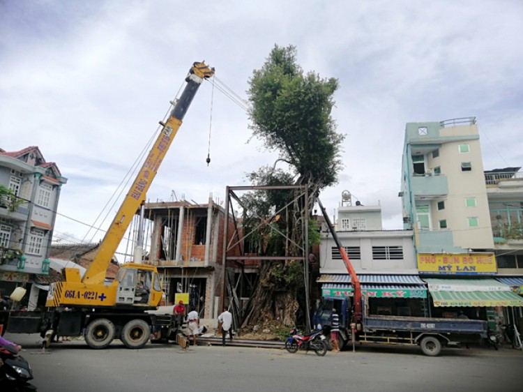 Xe cẩu tiến hành dịch chuyển cây da trở về vị trí ban đầu