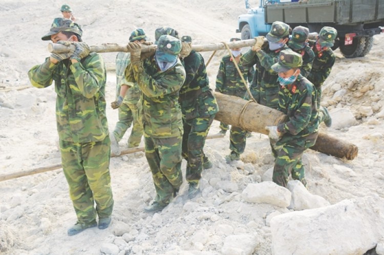 Bộ đội Lữ đoàn Công binh 25 thu gom chuẩn bị hủy nổ bom, mìn tại Trường bắn Chi Lăng.