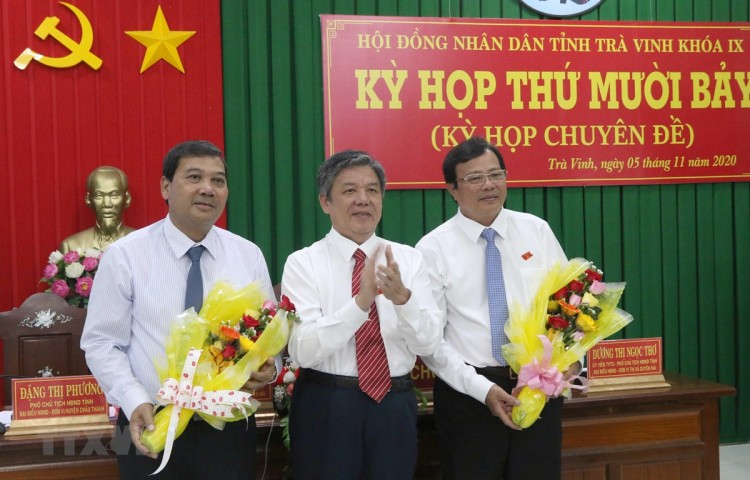 Bí thư Tỉnh ủy Trà Vinh Ngô Chí Cường tặng hoa chúc mừng tân Chủ tịch HĐND tỉnh Trà Vinh Kim Ngọc Thái (trái) và tân Chủ tịch UBND tỉnh Trà Vinh Lê Văn Hẳn (phải). (Ảnh: Thanh Hòa/TTXVN)