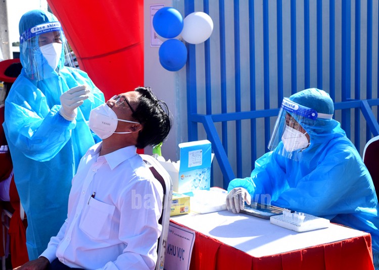 Các sự kiện diễn ra trên địa bàn thị xã, đều được phối hợp test nhanh nhằm đảm bảo an toàn cho đại biểu tham dự (trong ảnh: test nhanh đại biểu tham dự lễ khánh thành Dự án Nhà máy Điện gió Hàn Quốc - Trà Vinh).