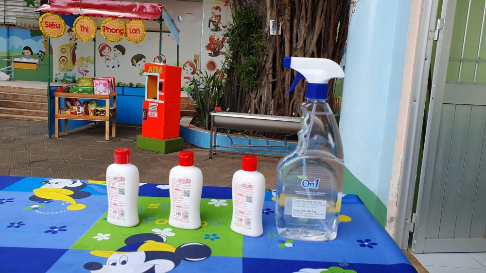 Trường Mầm non Phong Lan (quận Bình Thủy) trang bị nước rửa tay phục vụ trẻ, phụ huynh khi đến trường.
