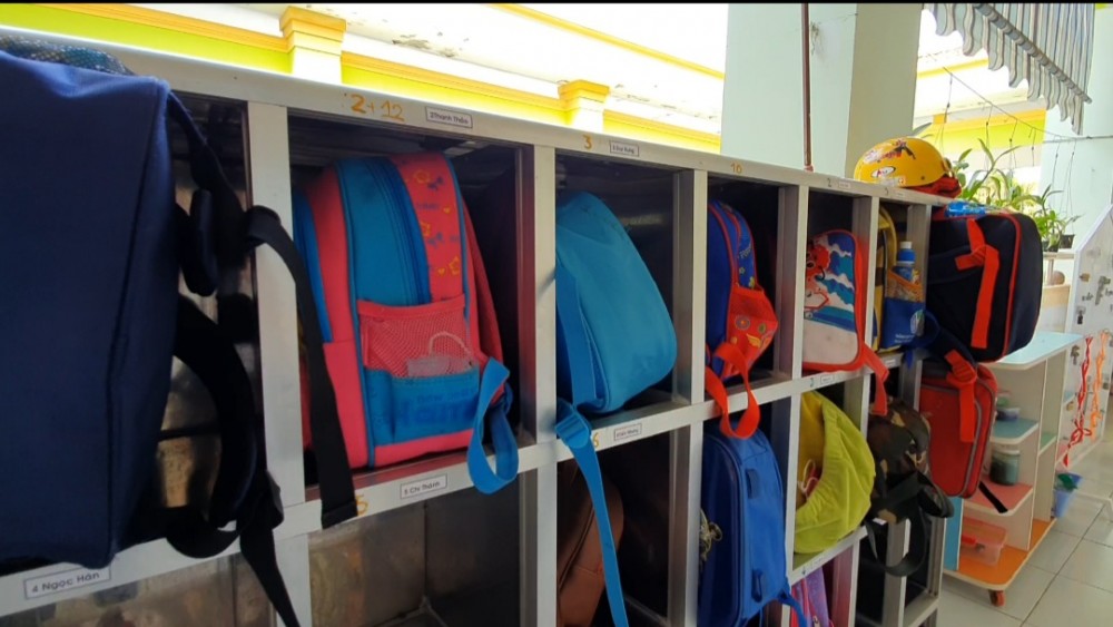Các vật dụng cá nhân của bé được xếp ngăn nắp trước lớp học.