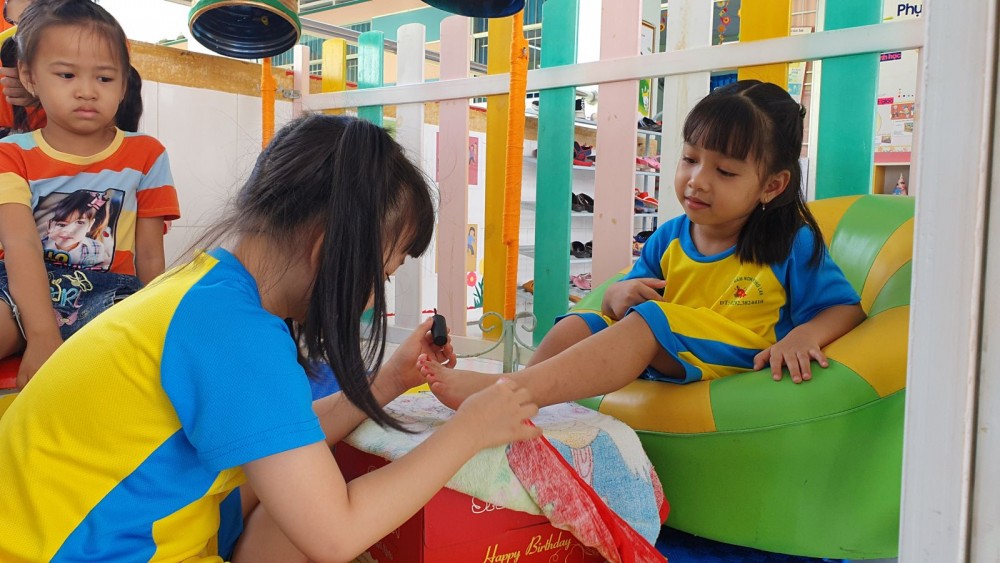 Các bé sắm vai làm thợ sơn móng-hoạt động vừa chơi vừa học, giúp trẻ phát triển kỹ năng, tư duy sáng tạo.