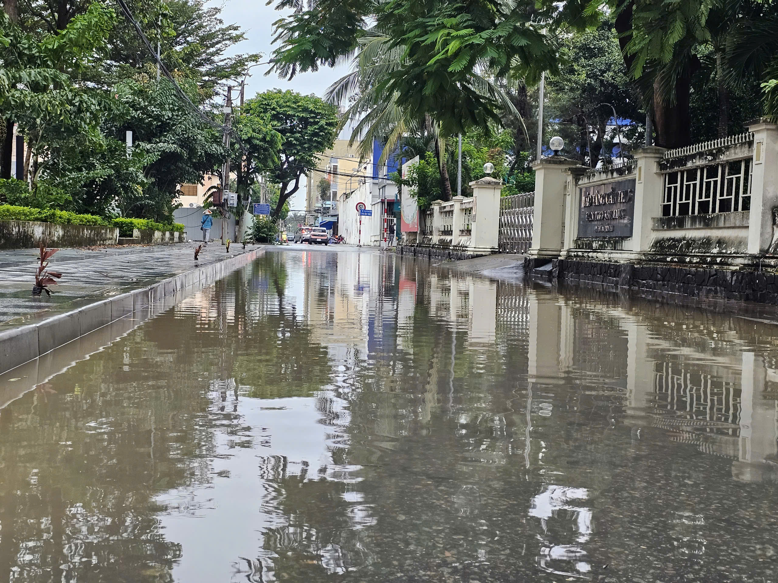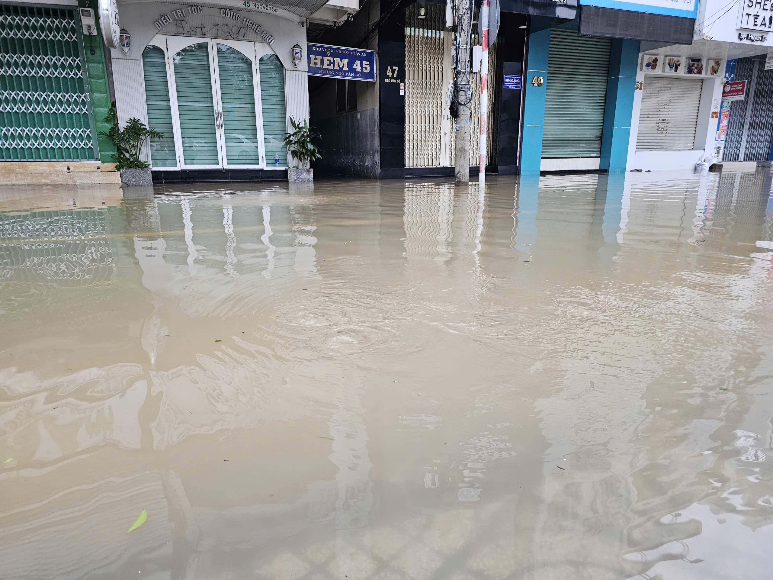 Đường Trần Quốc Toản (phường Ninh Kiều) chưa từng ngập do triều cường trong năm 2025 nay cũng lênh láng nước - Ảnh: CHÍ QUỐC