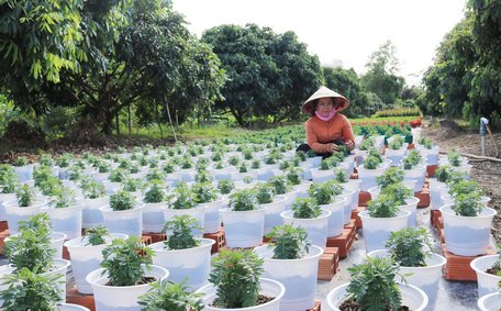 Kết hợp trồng hoa tết trong vườn cây ăn trái của gia đình, mỗi mùa tết qua đi, chị Nguyễn Thị Thủy (ấp Tân Vĩnh- xã Trường An) càng thêm phấn khởi với thu nhập mang lại từ những chậu hoa. Chị Thủy chia sẻ: “Hồi xưa, tôi dệt chiếu kiếm sống rồi thấy cô hàng xóm trồng bông nên qua coi học hỏi trồng theo. Trồng đợt bông đầu tiên thấy có lời, vậy là vợ chồng tôi mạnh dạn mở rộng, vừa trồng vừa học hỏi rút kinh nghiệm qua từng năm”. Năm nay, chị Thủy trồng 3.000 chậu hoa các loại như hoa vạn thọ, mào gà, cúc Đài Loan,…