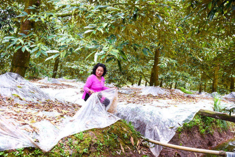 Đậy bạt phủ gốc là một trong các kỹ thuật cần thiết để xử lý sầu riêng ra hoa nghịch vụ.