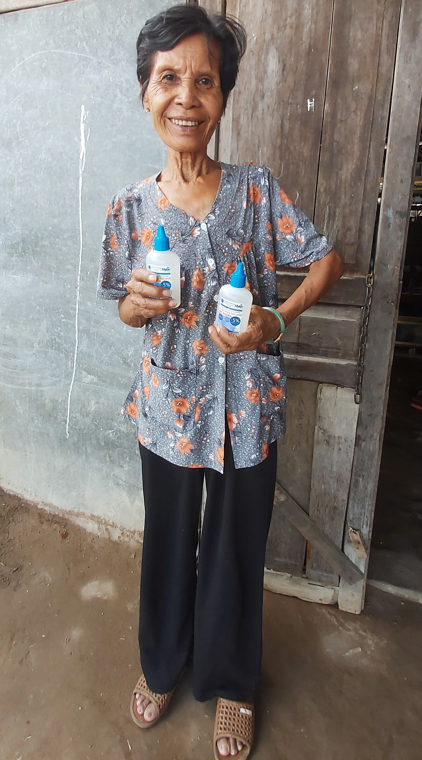 Bà Sơn Thị Sê Da vui mừng khi nhận được chai nước rửa tay của Trường Đại học Trà Vinh.