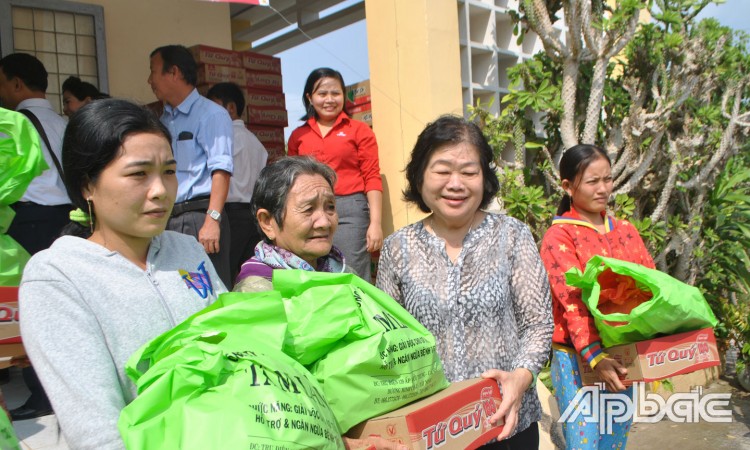 Nguyên Phó Chủ tịch nước Trương Mỹ Hoa cùng các nhà tài trợ đã đến thăm, tặng quà tết cho hộ nghèo 2 xã Tân Thạnh và Tân Thới, huyện Tân Phú Đông. Ảnh: H.Trung