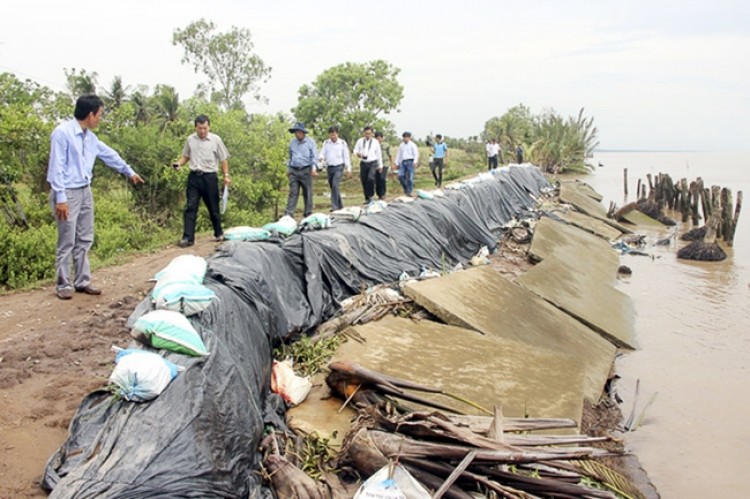 Khảo sát tình trạng sạt lở bờ sông tại xã An Thạnh 3, huyện Cù Lao Dung (Sóc Trăng). Ảnh: THIỆN HẢI