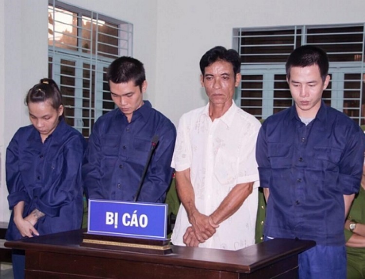 Các bị cáo An, Đại, Bắc, Voòng (từ trái sang) tại phiên tòa sơ thẩm.