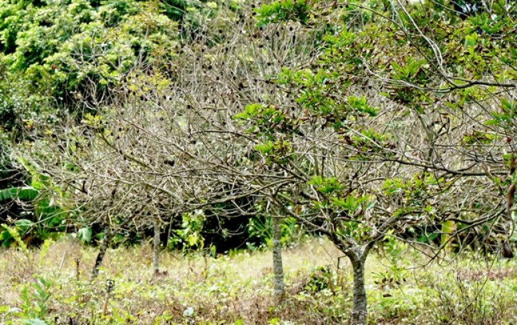Nhiều vườn chôm chôm ở xã Bình Hòa Phước (Long Hồ, Vĩnh Long) bị rụng lá do ảnh hưởng bởi xâm nhập mặn. (Ảnh: Lê Thúy Hằng/TTXVN)