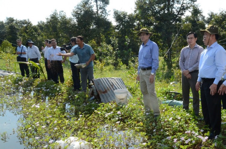 Lãnh đạo tỉnh Tiền Giang tham quan mô hình trữ nước ngọt phục vụ sản xuất.